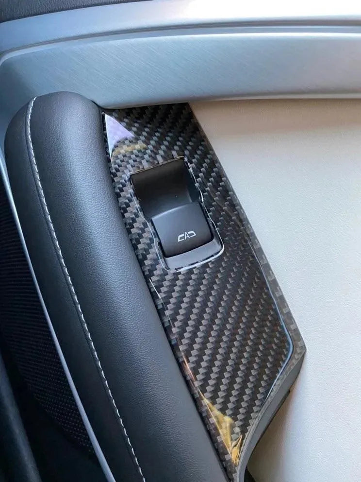 This carbon fiber interior Window Switch Trim Overlay is made using real carbon fiber with a glossy finish.