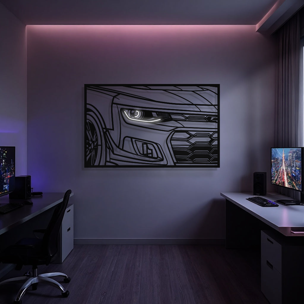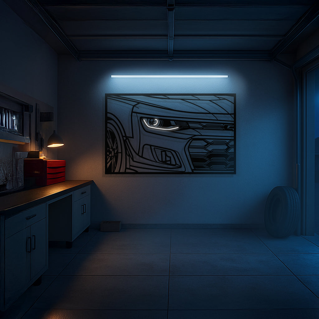 This 2024 Camaro ZLE 1LE Apex Front View Metal Neon Frame Wall Art will turn any car enthusiast's home, garage, hallway, living room, bedroom, or office into a unique space, add a stylistic look and captivate petrolheads as well as visitors.