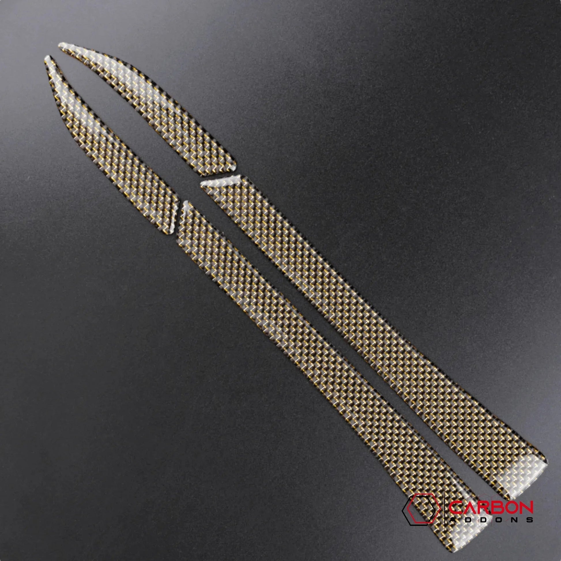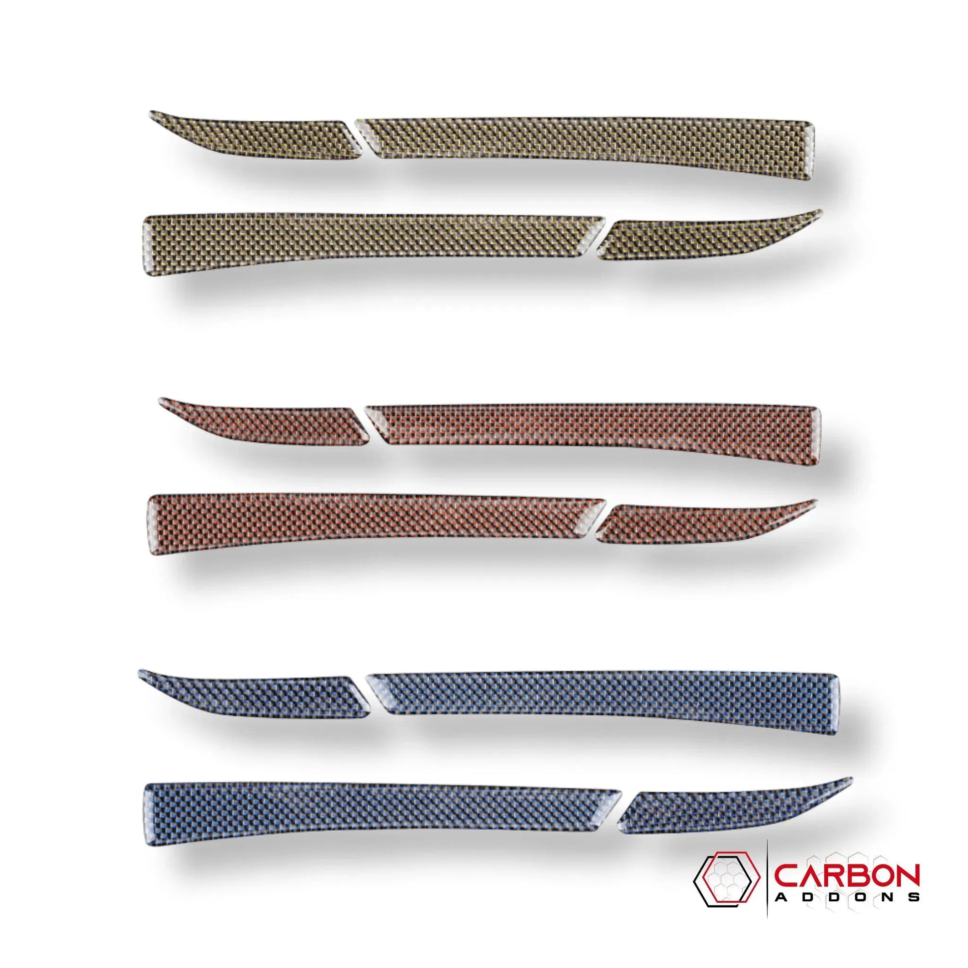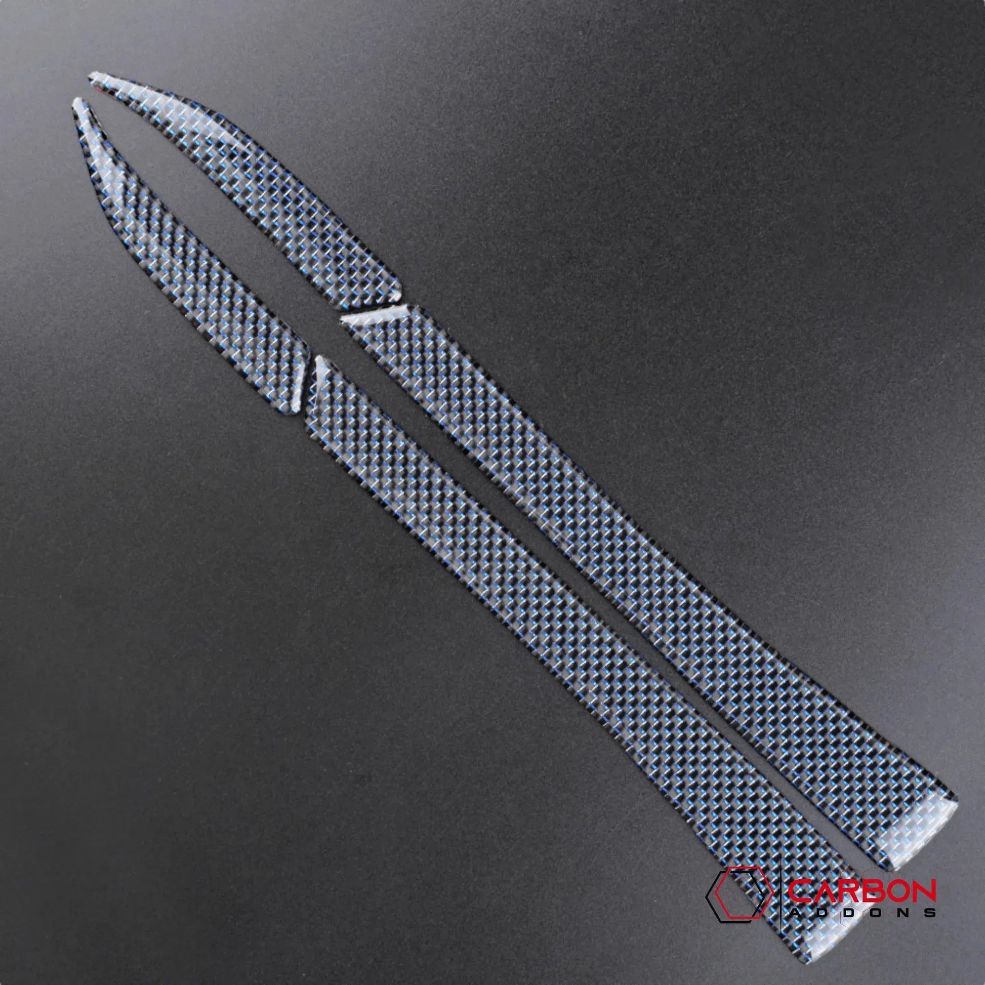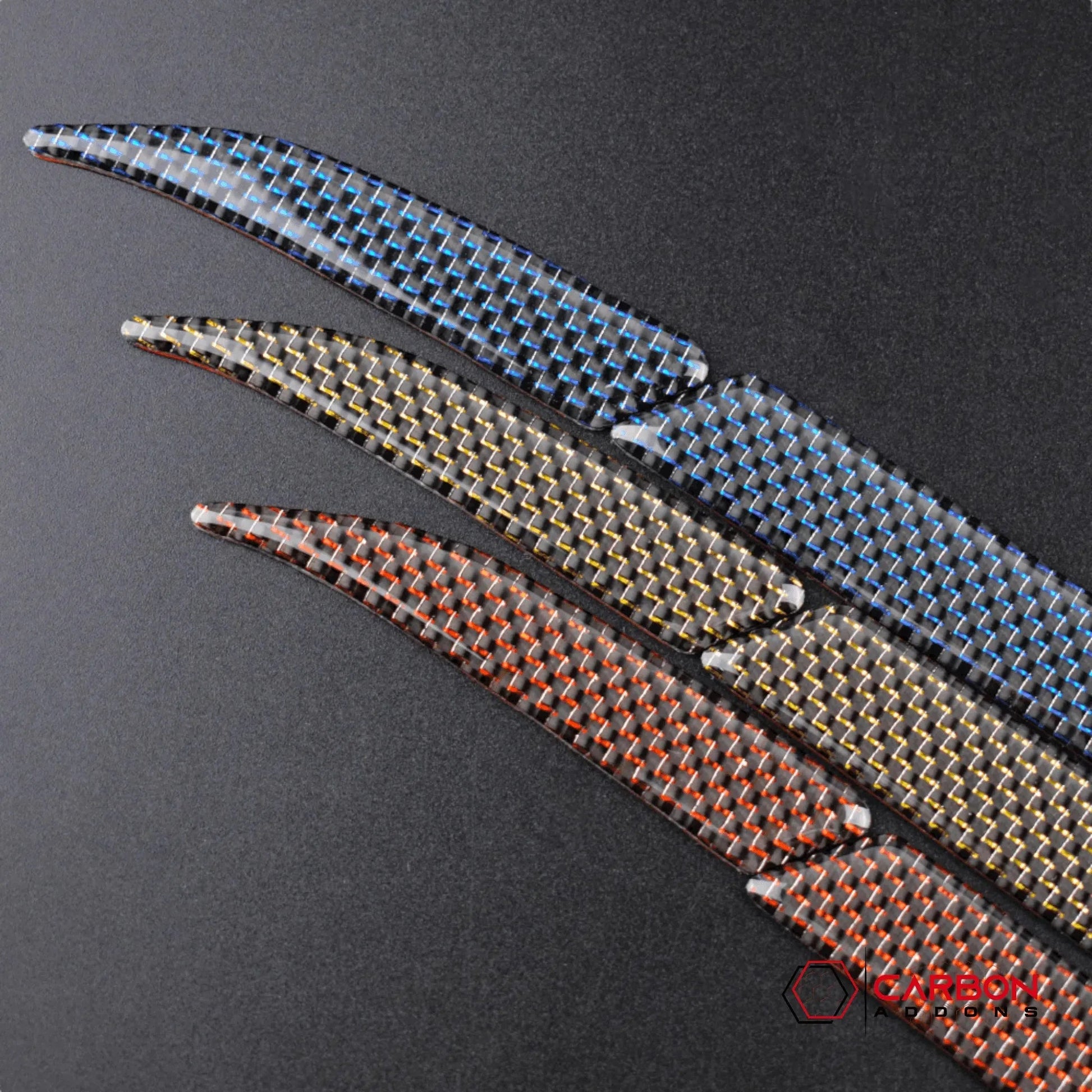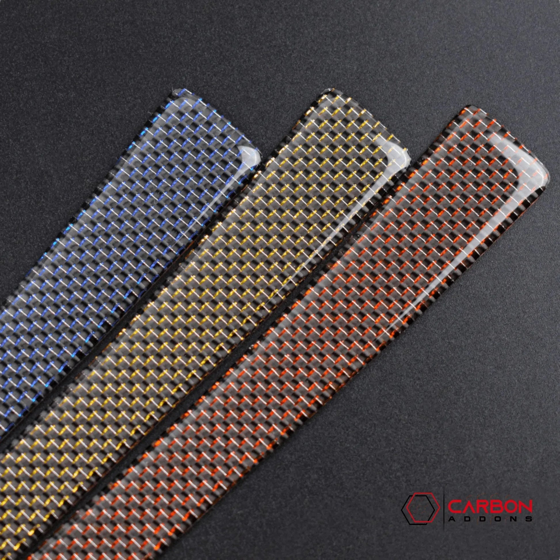 This carbon fiber Exterior Rear View Mirror Trim Overlay is made using real carbon fiber woven in a 2x2 twill weave with an added metallic thread that reflects it's color for an added accent to the already beautiful carbon fiber strands. If you do not want the added metallic thread, you can find our standard carbon fiber version on another listing.