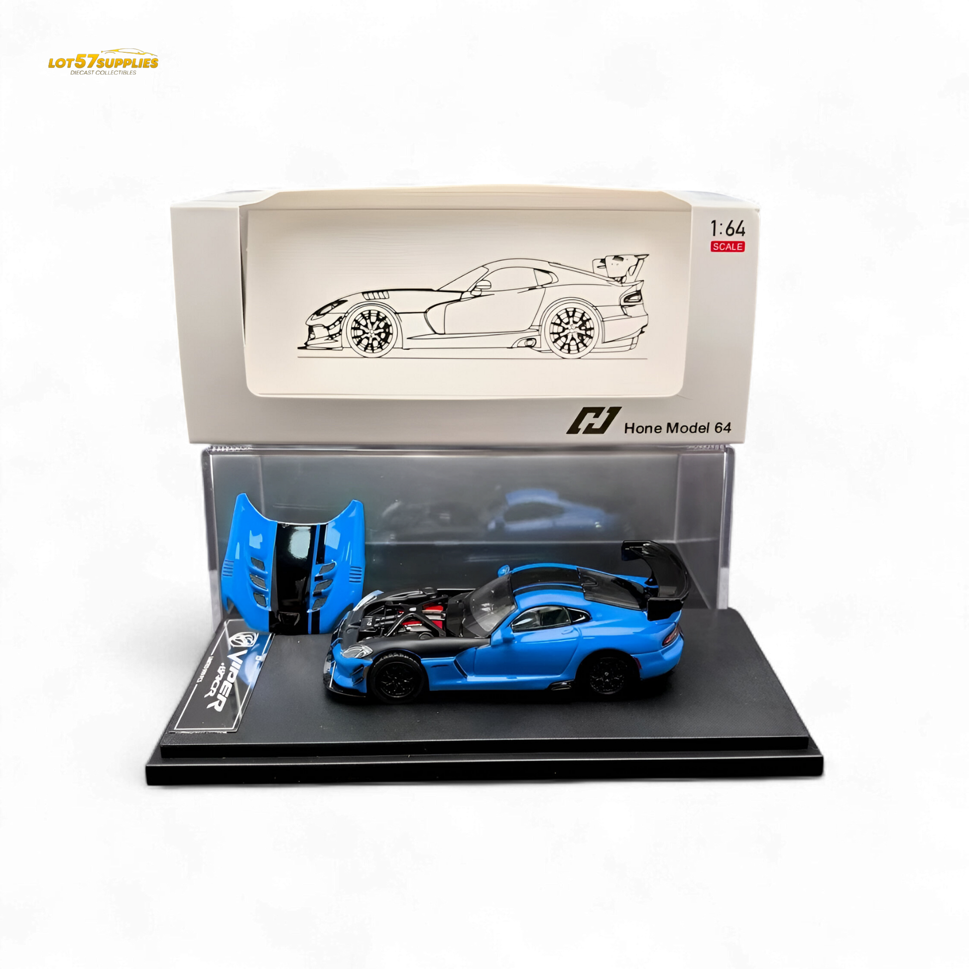 Hone Model Dodge VIPER ACR 1:64 Scale Diecast Model in Competition Blue. This highly detailed collectible sports car features authentic design and craftsmanship. Made from premium diecast materials, it offers realistic features and vibrant color. Perfect for collectors and enthusiasts looking for a quality model car.