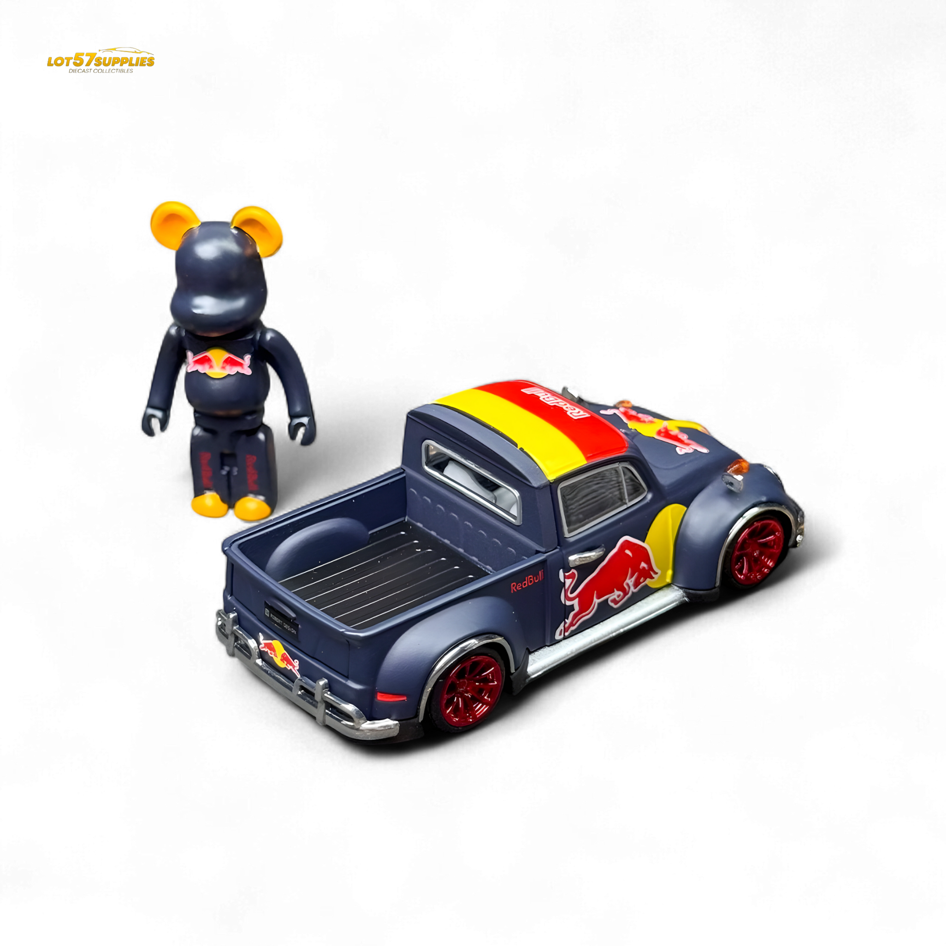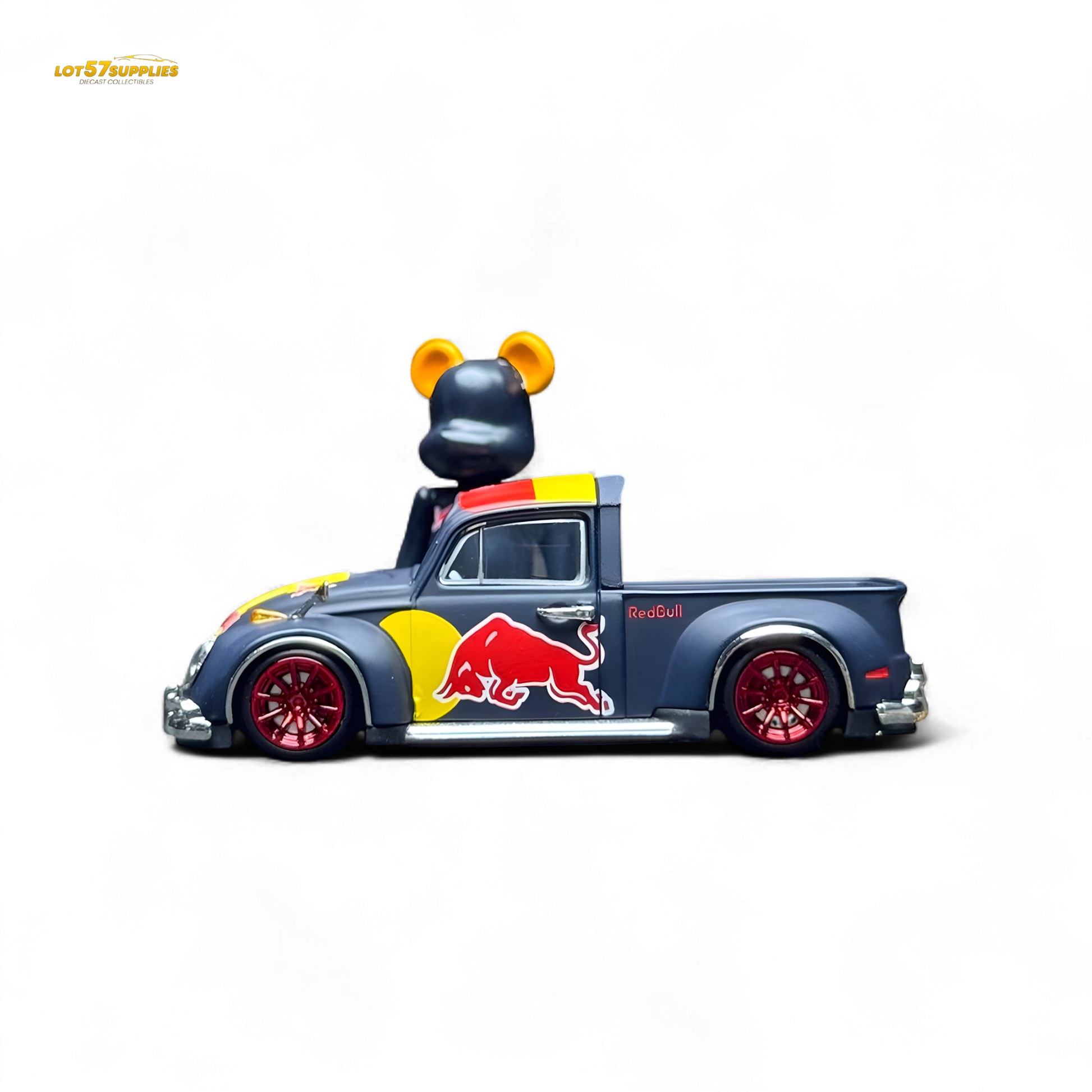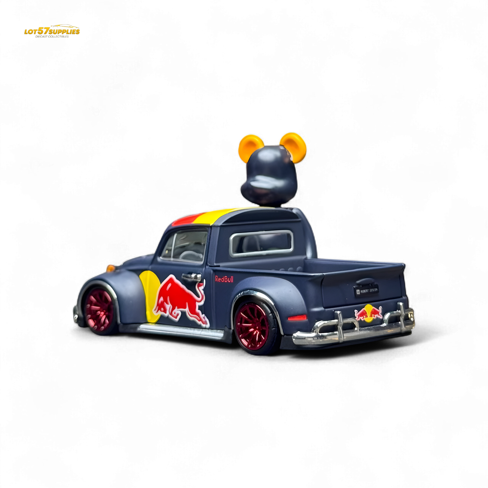 This custom 1:64 scale VW Beetle truck is decked out in iconic Red Bull racing livery, complete with vivid red, yellow, and navy tones. Featuring eye-catching red rims and detailed sponsor logos, this casting brings high-energy vibes to any diecast collection. Includes a matching Red Bull-themed bear-style figure to elevate your shelf game. A bold piece for collectors who like their miniatures with attitude and branding power.