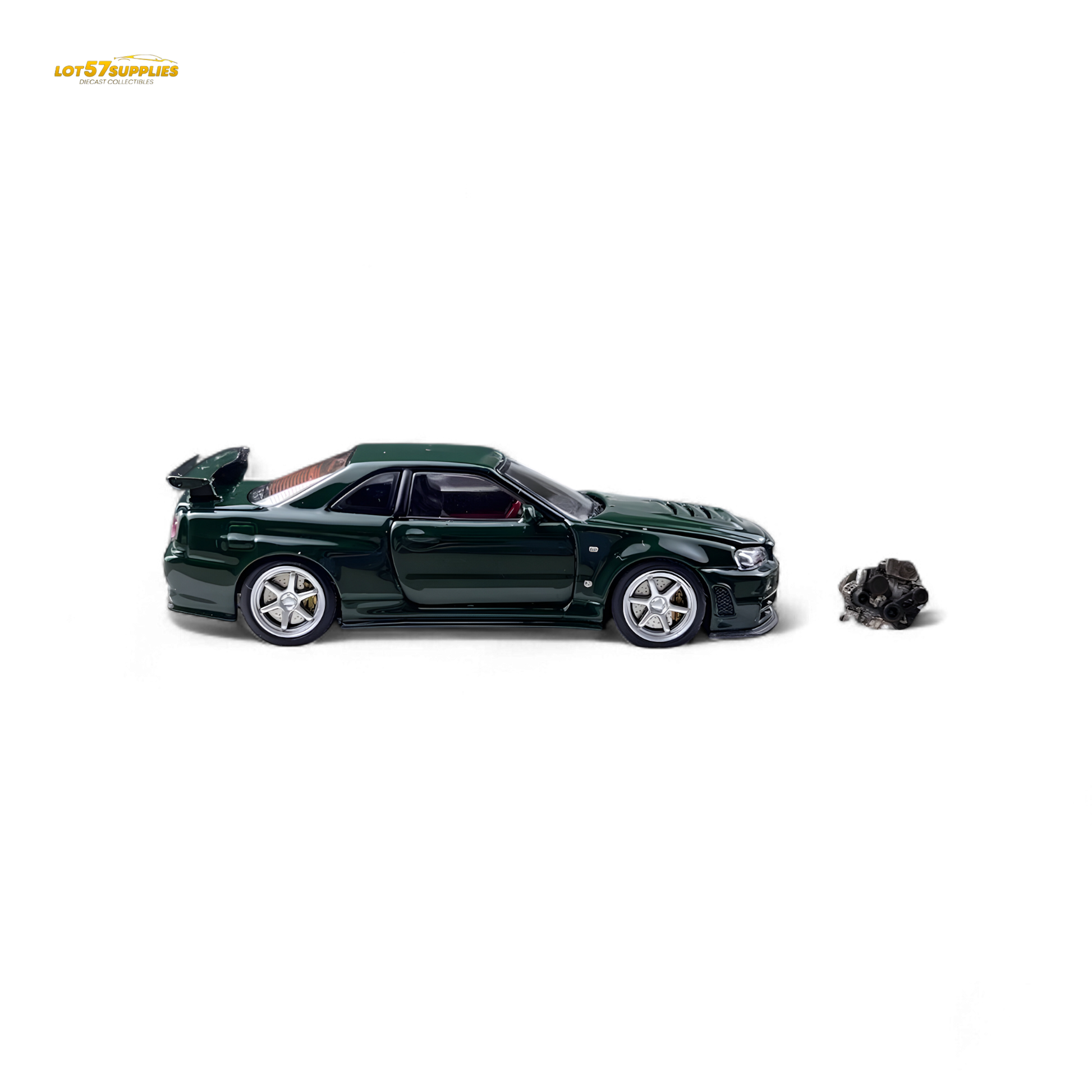 Detailed diecast model of the Nissan GTR R34 Z-TUNE in British Green color, crafted in 1:64 scale by PGM. This fully opened ordinary version collectible features precise craftsmanship, high-quality materials, and accurate detailing ideal for collectors and enthusiasts. Perfect for fans of Nissan and diecast model cars.
