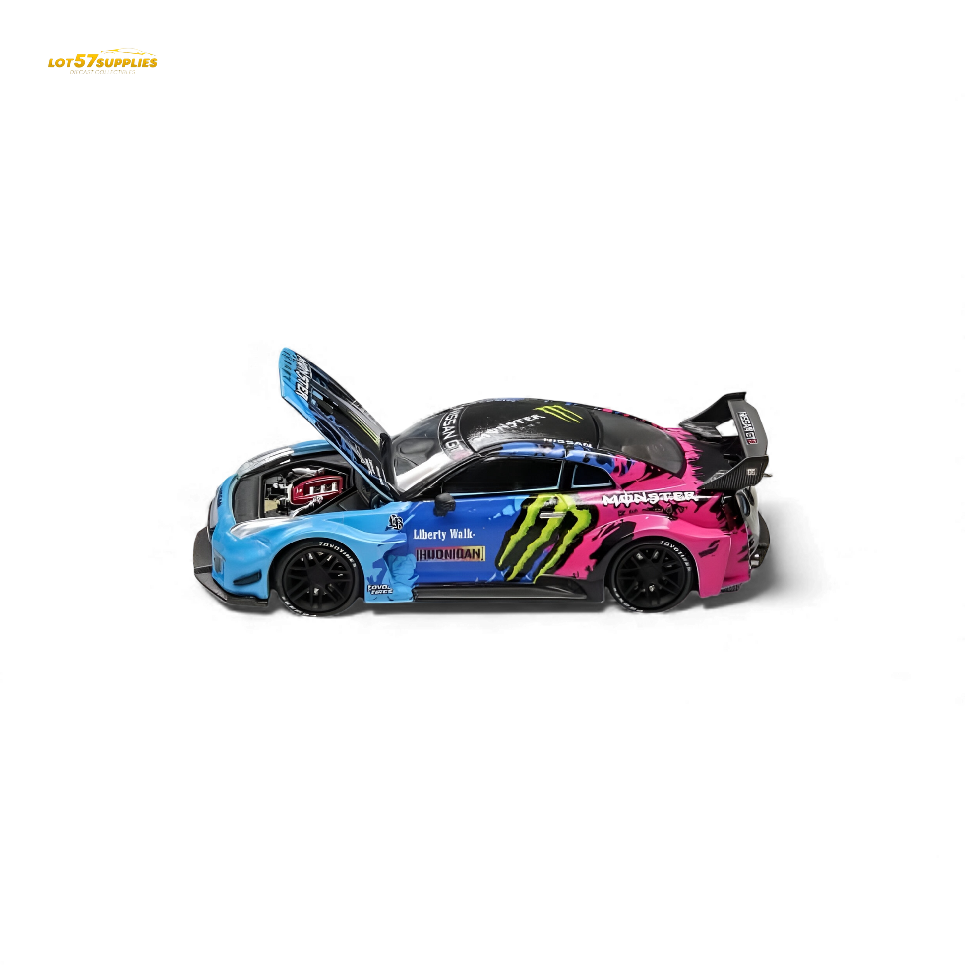 Features: Opening hood with detailed engine, Liberty Walk wide-body kit, Hoonigan/Monster Energy livery. One of every 6pcs includes a Lowrider Chase version! (VIP members will get priority)