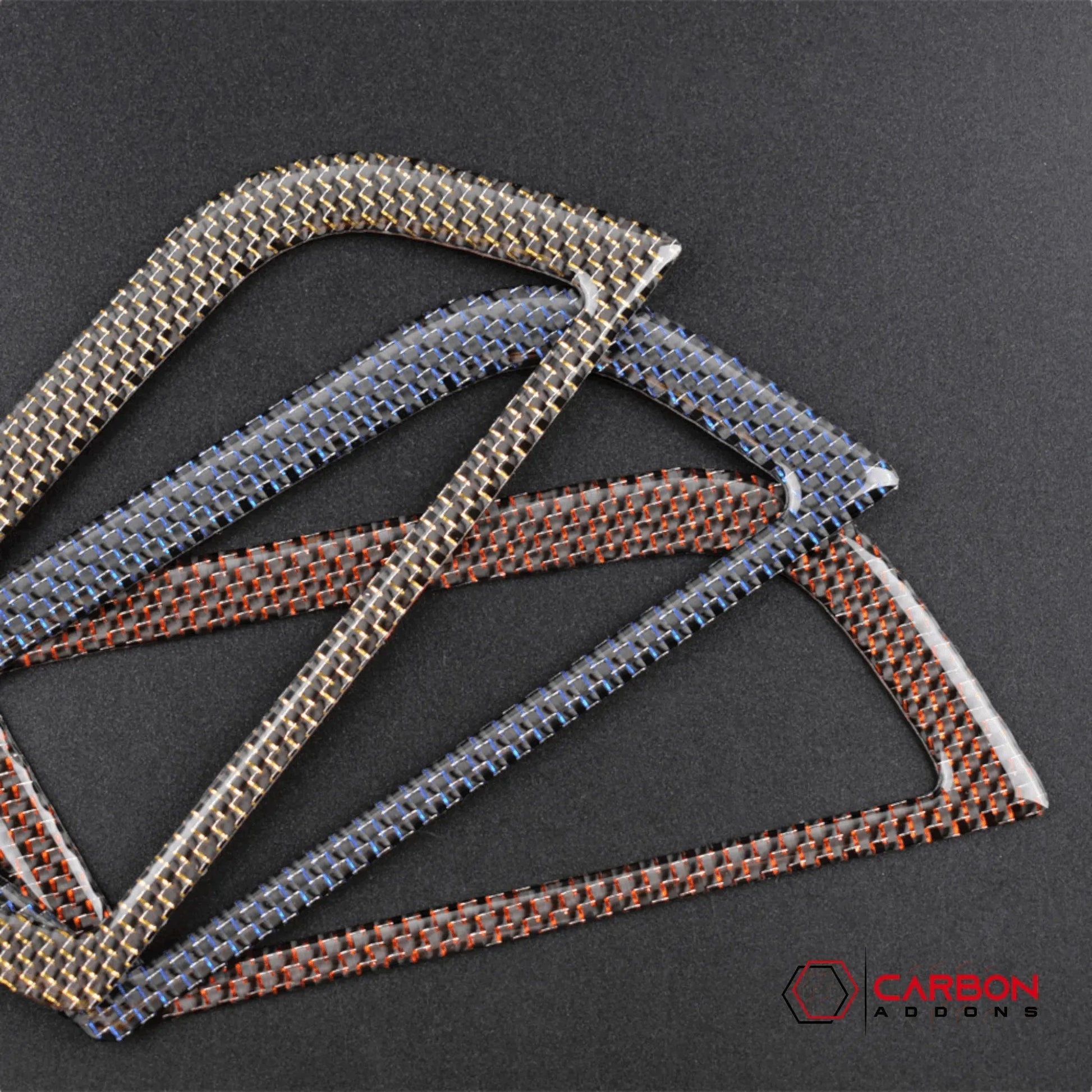 This carbon fiber interior dashboard AC vent trim overlay is made using real carbon fiber woven in a 2x2 twill weave with an added metallic thread that reflects it's color for an added accent to the already beautiful carbon fiber strands. If you do not want the added metallic thread, you can find our standard carbon fiber version on another listing.