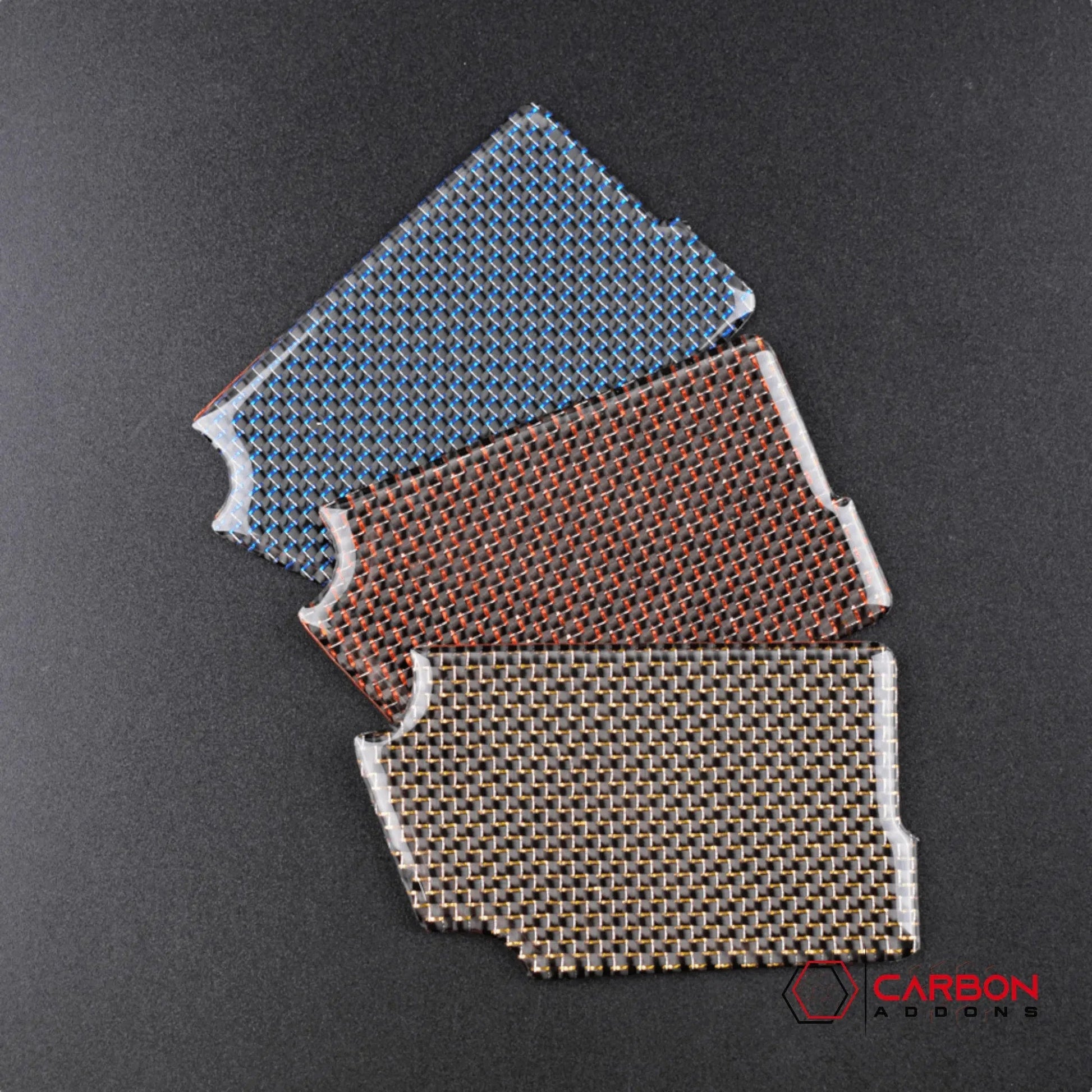 This carbon fiber interior Door Handle Trim Overlay is made using real carbon fiber woven in a 2x2 twill weave with an added metallic thread that reflects it's color for an added accent to the already beautiful carbon fiber strands. If you do not want the added metallic thread, you can find our standard carbon fiber version on another listing.