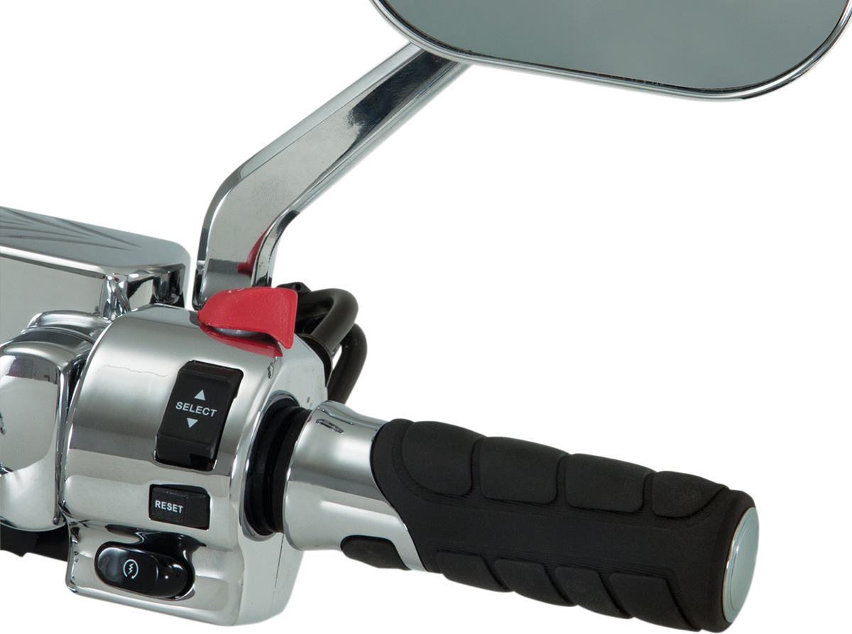 - Contoured chrome trim encases the raised thumb position area, adding not only comfort but style