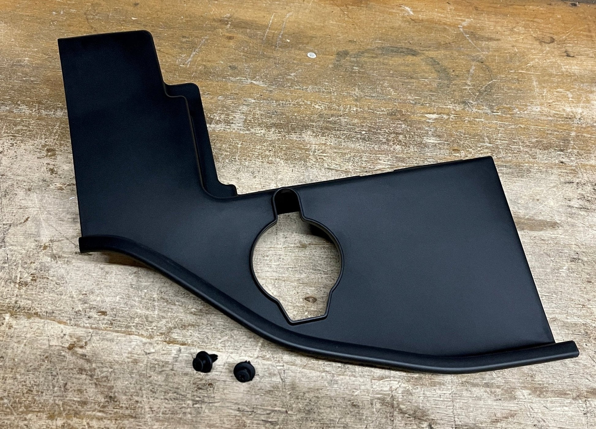 Note: If you have a cable across the front of your fuse box, you will need to disconnect it from the push pin bar and move it down and out of the way, then affix this cover to the push pin bar. See photos.