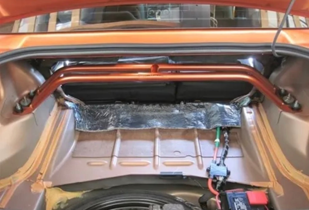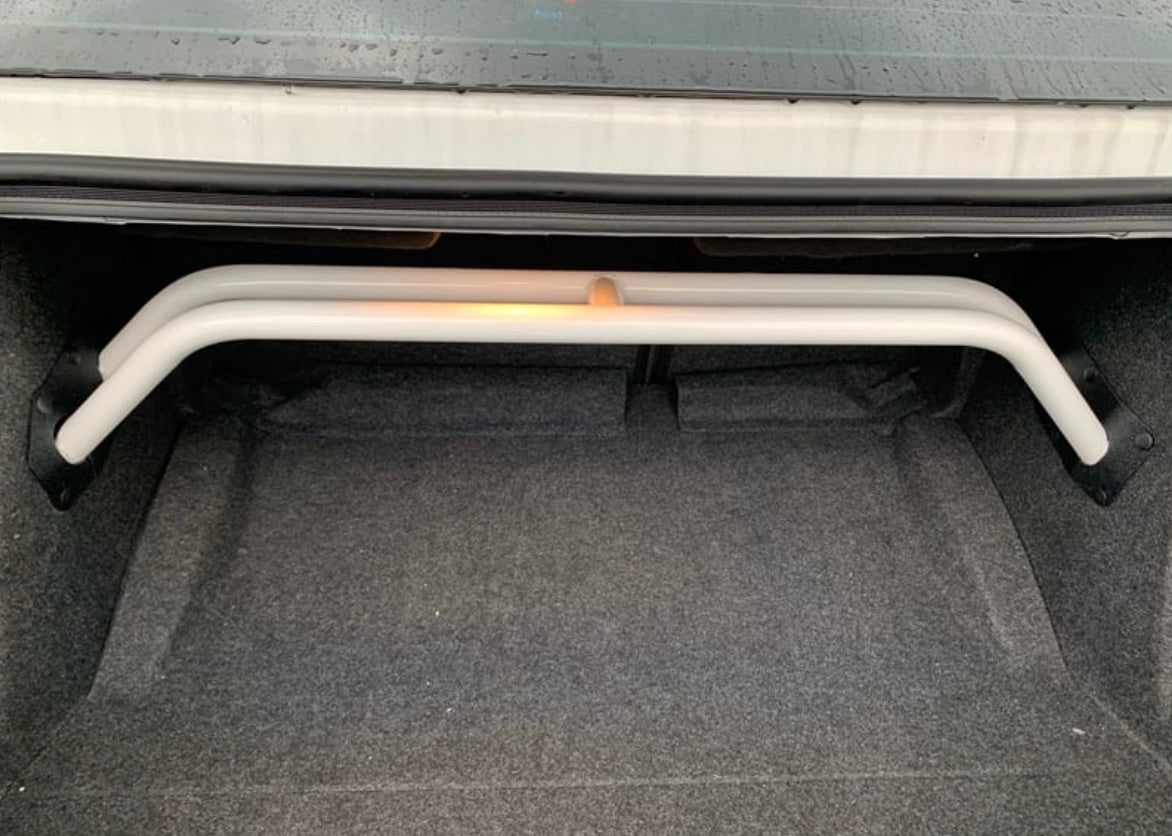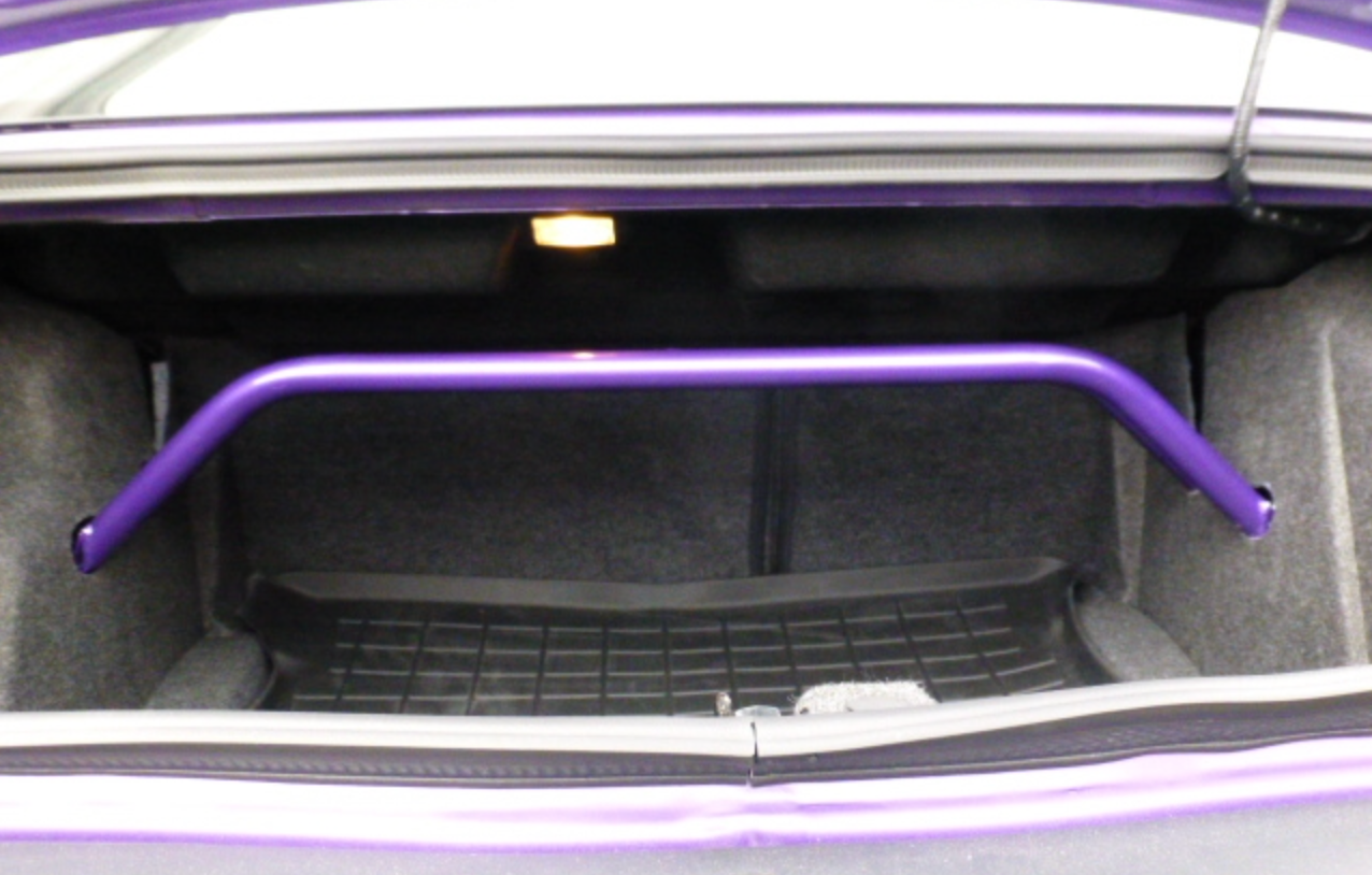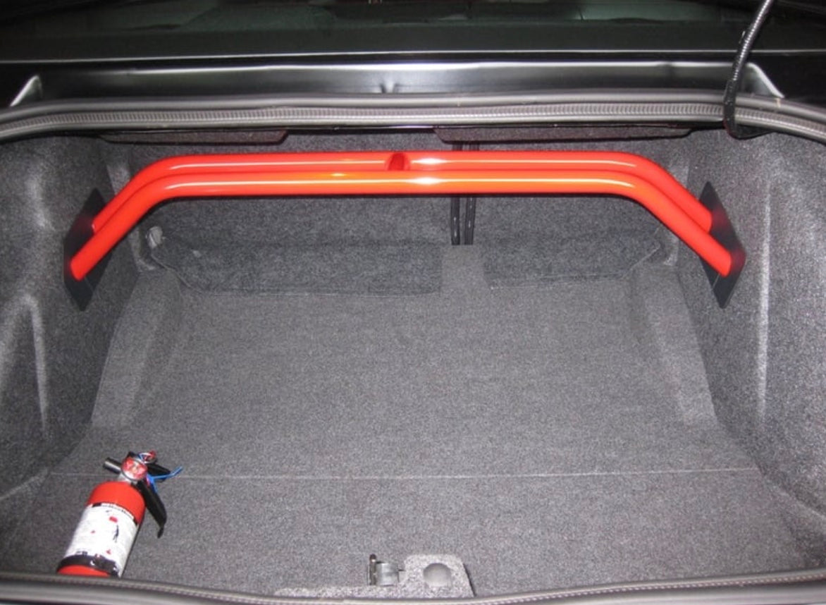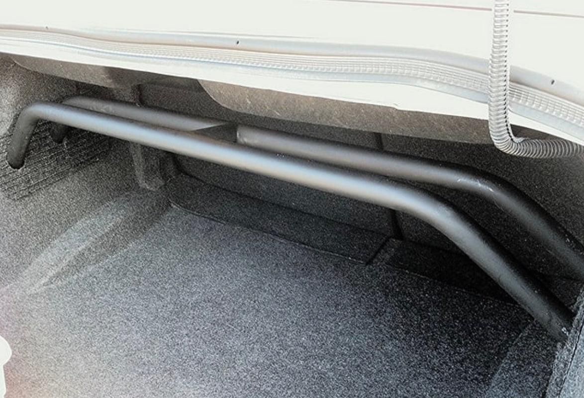 With our 2-point arched rear shock tower brace you get the benefits of tightening your rear suspension but you do not lose very much trunk space. Our steel is laser cut, precision welded by hand.