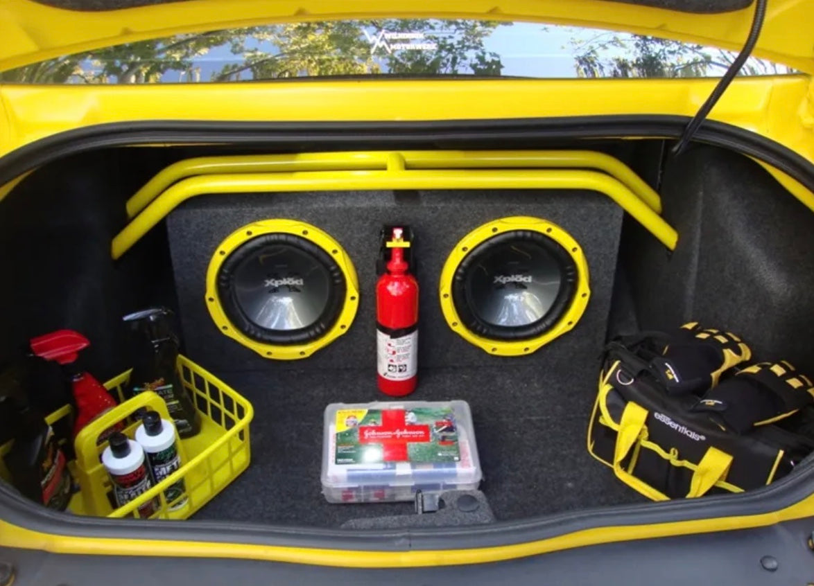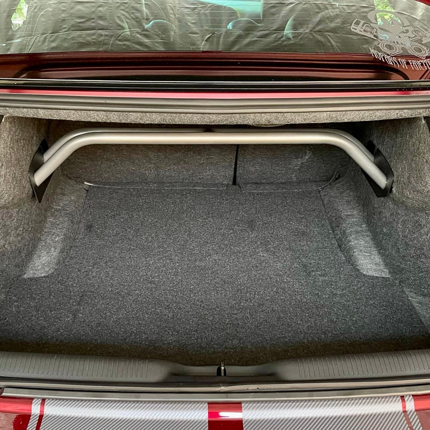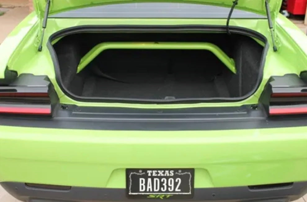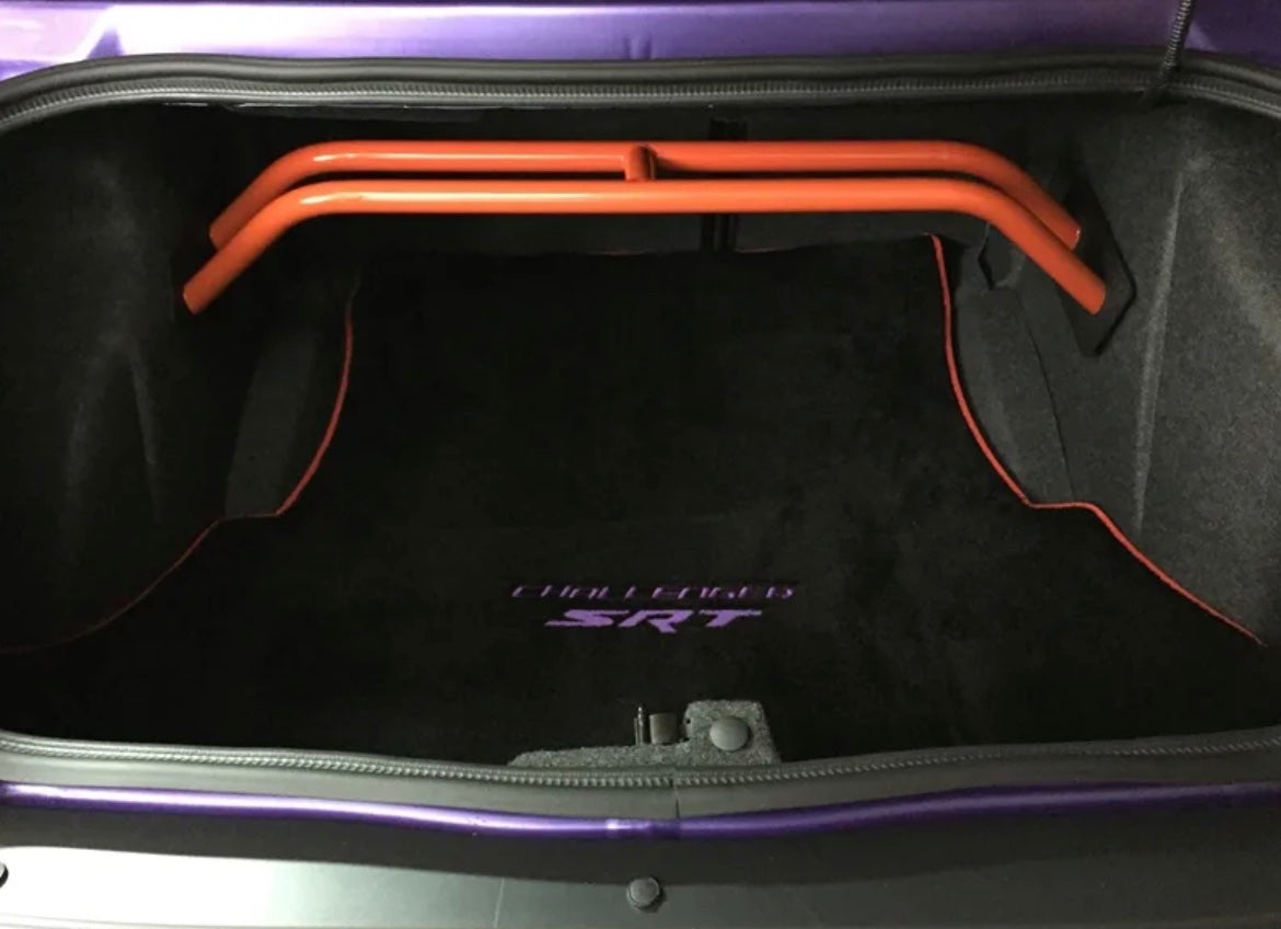With our 2-point arched rear shock tower brace you get the benefits of tightening your rear suspension but you do not lose very much trunk space. Our steel is laser cut, precision welded by hand.