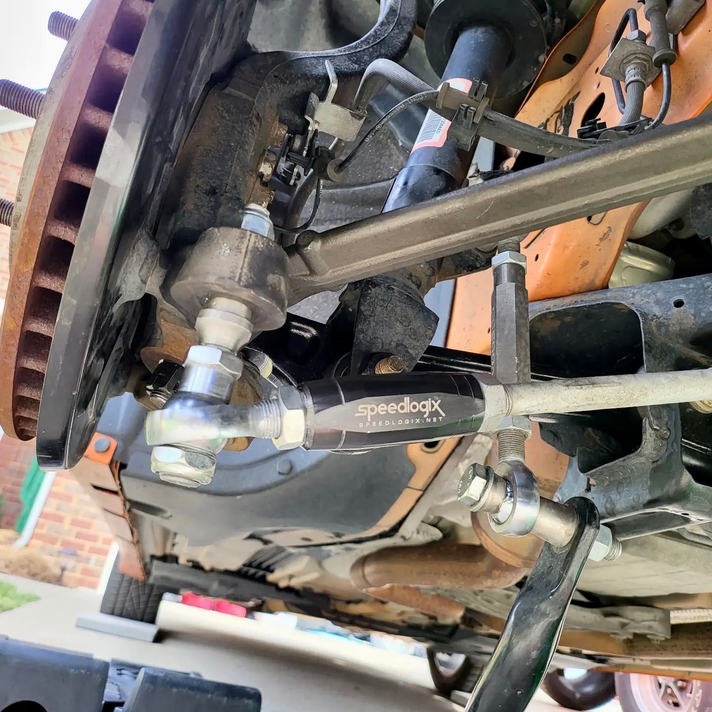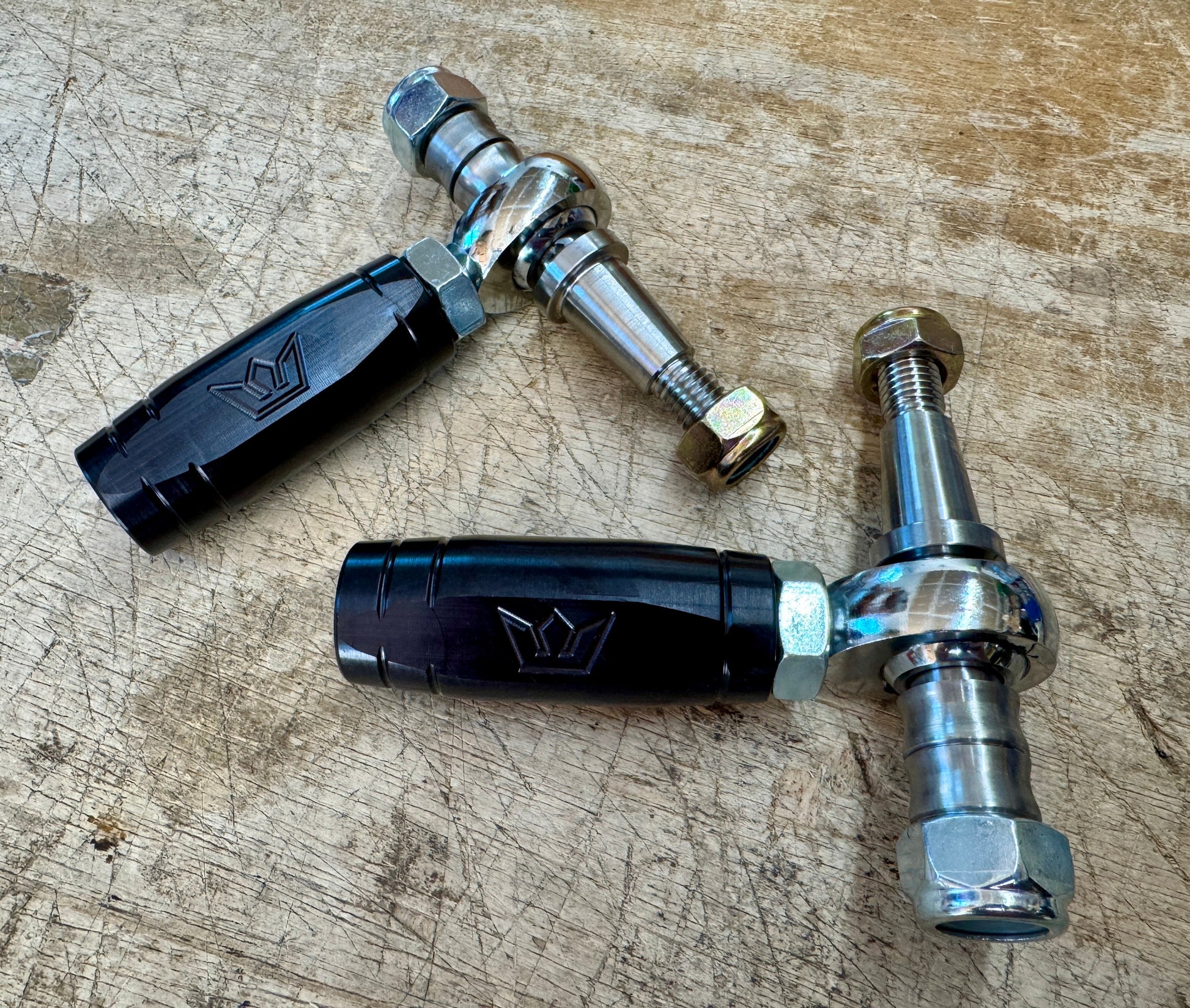 Correct your bumpsteer with our latest version (released September 2023): billet aluminum body CNC-machined, then anodized, with 17-4 pre-hardened stainless ball joint studs, forged chromoly Teflon-lined Heim joints, and nylon lock nuts.