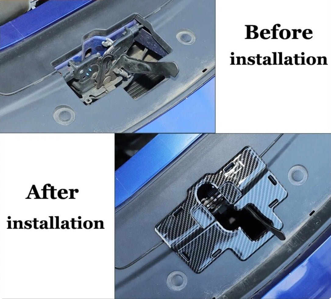 This carbon fiber print hood latch cover installs over the open space in the engine bay.