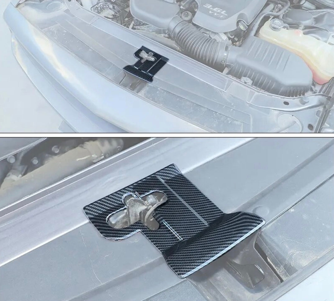 This carbon fiber print hood latch cover installs over the open space in the engine bay using included (installed) 3M tape.