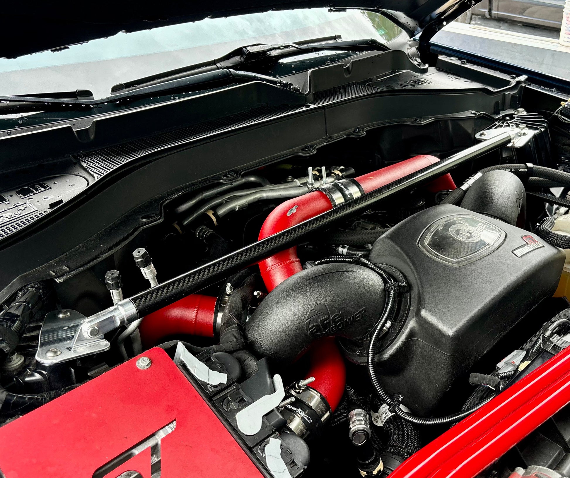 Our carbon fiber front strut tower brace is made in-house in the USA from genuine carbon fiber tubes that connect to CNC machined billet aluminum mounting plates and connectors, with quick release zinc-plated pins for easy removal. Re-uses factory mounting hardware.