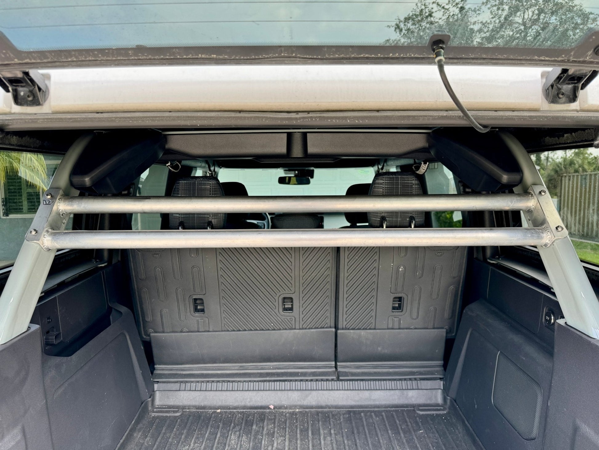 Twin tube aluminum rear roll bar brace adds rigidity and reduces and eliminates rattles, shakes and twisting from your Bronco during off-roading and normal driving by laterally connecting the roll bars.