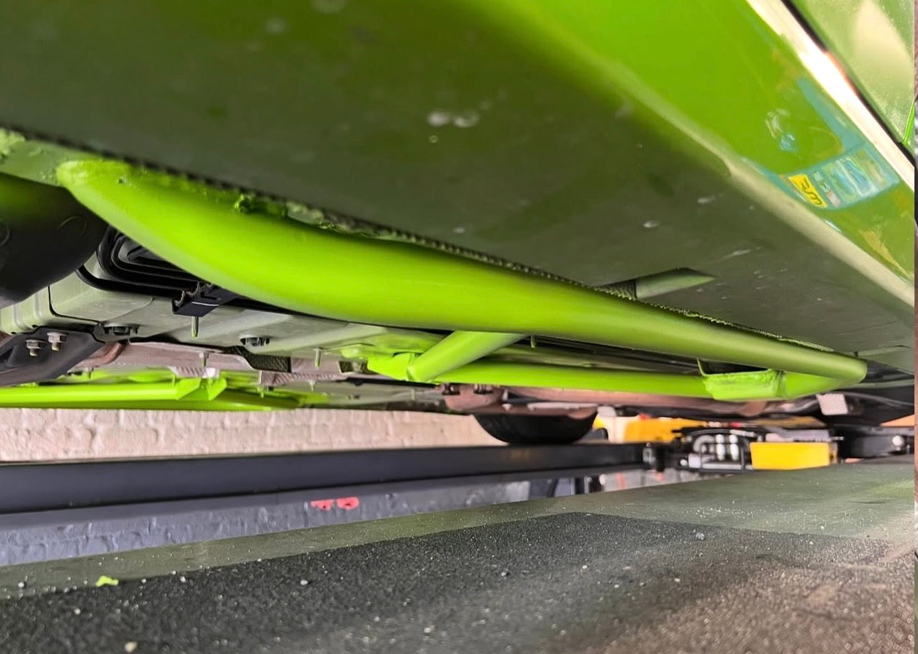 Our subframe connectors tie together the inner/outer frame rails and the rear lower control arm mount. Braces are powdercoated black.