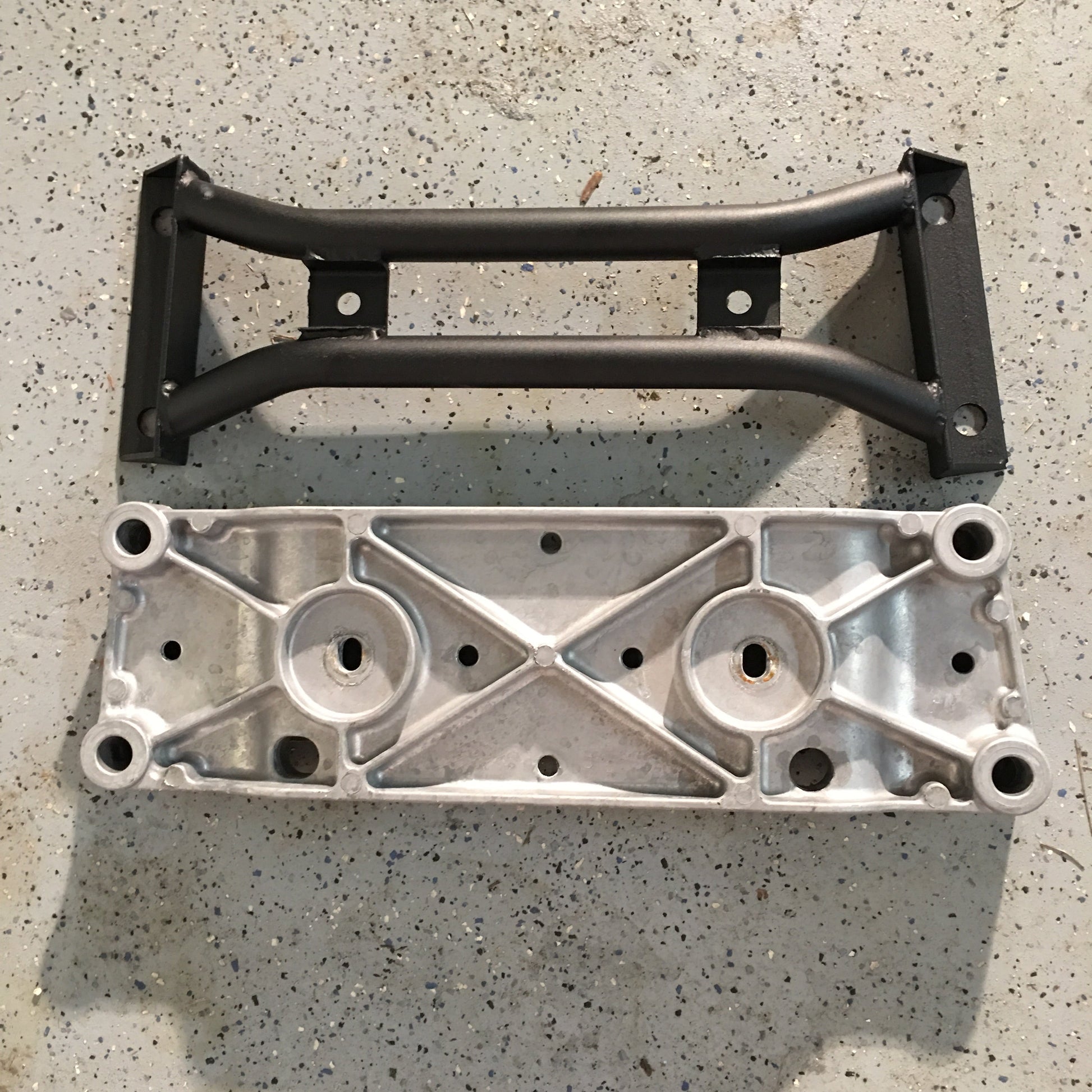 Our 6-speed transmission crossmember is designed using steel tubing for a very light, yet stronger and more rigid part. By welding the tubes to gusseted angle we were able to greatly increase the strength both vertically and horizontally, while shaving half the weight from the stock mount.