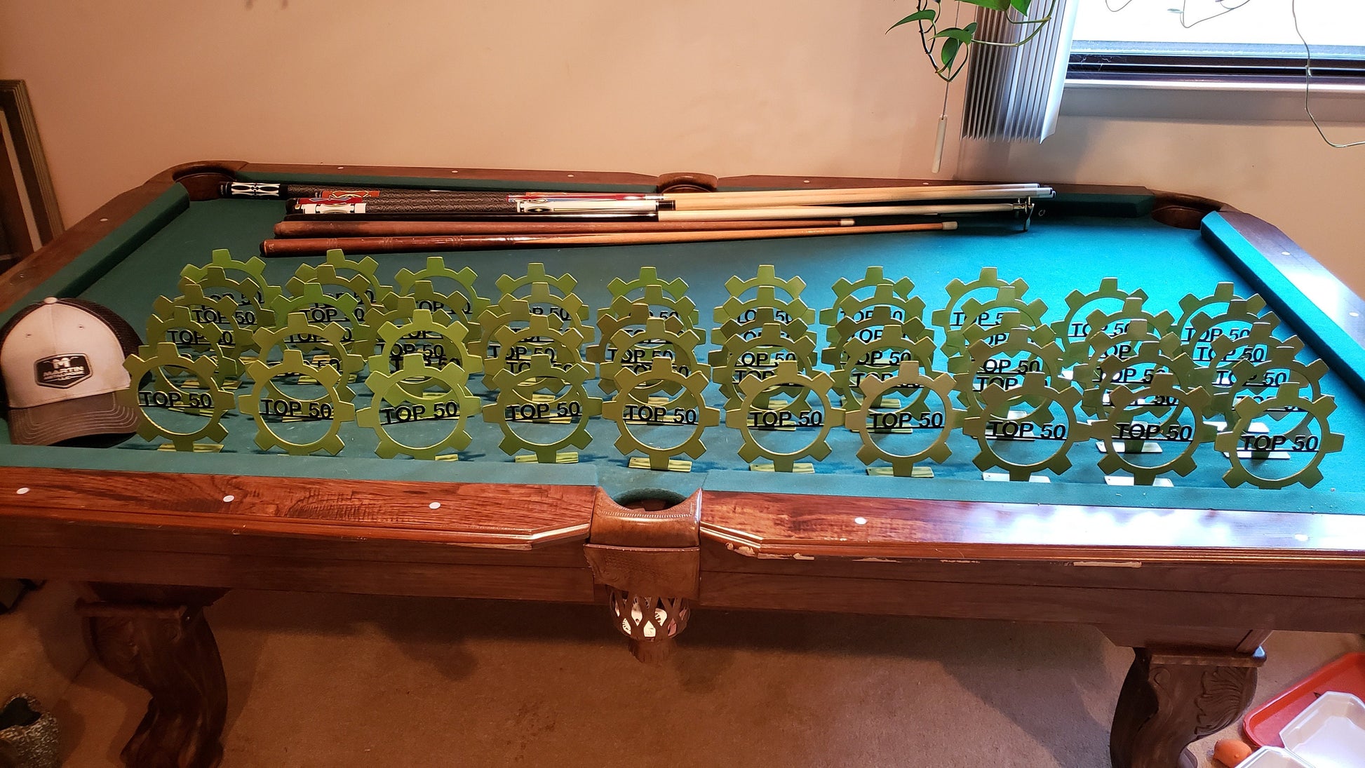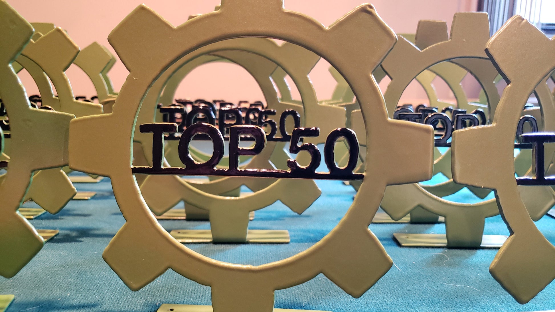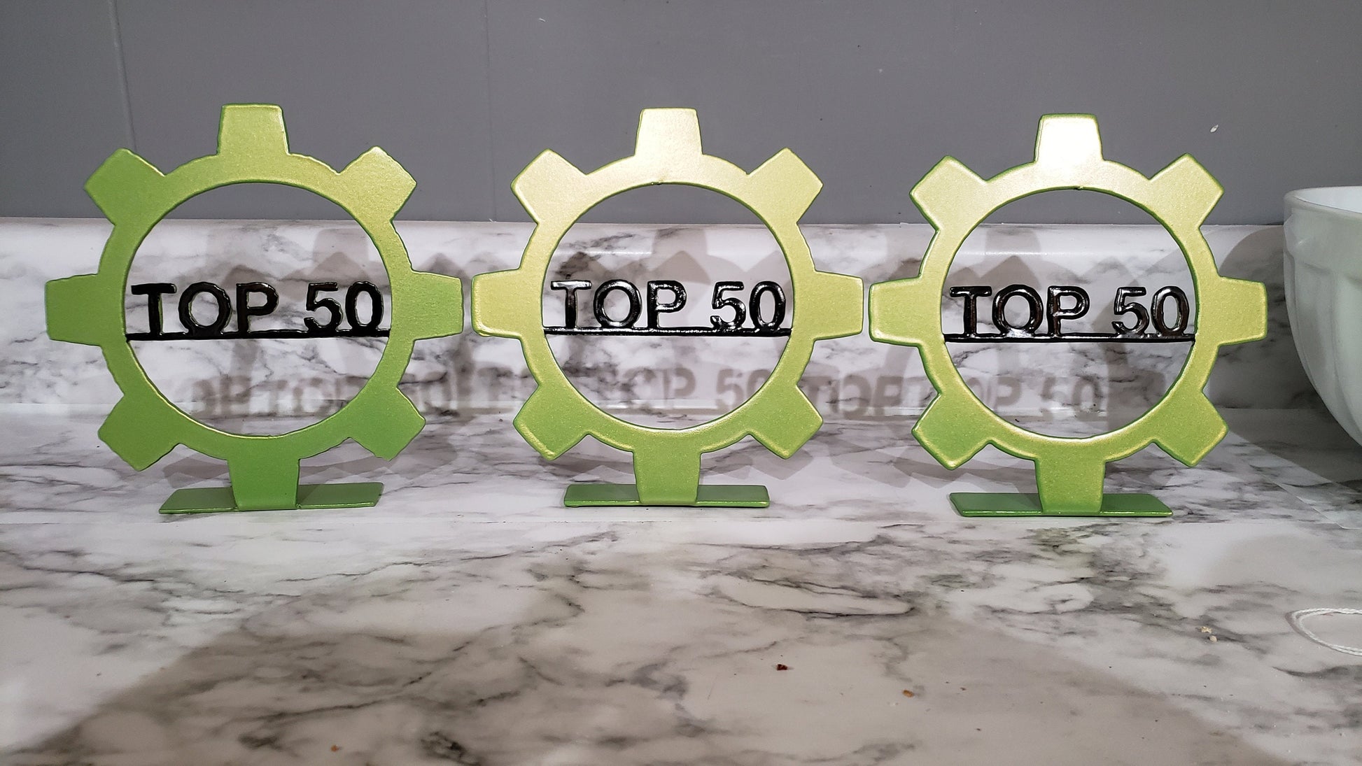 Looking for a memorable giveaway for your next car show or automotive event? These Top 50 trophies are just what you need to make your show stand out! Each trophy features a gear-shaped design measuring 7x7 inches (plus a sturdy 2-inch stand), crafted from 14-gauge steel for a heavy-duty, lasting feel. Choose from a wide selection of gear colors to match your event theme. Words are available in bold black or white for maximum impact.